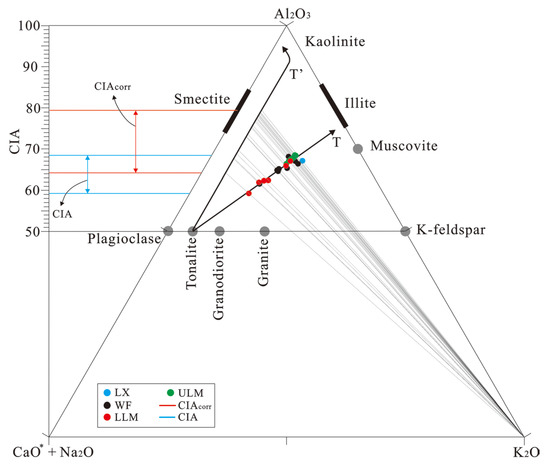 The Al2O3–CaO* + Na2O–K2O ternary diagrams (Figure 6) show that the predicted weathering trend line (T’) is parallel to the Al2O3–CaO* + Na2O line and points towards the endmember of Al2O3. Starting from the K2O end member, crossing the sample data point and intersecting with T’, the CIAcorr values can be obtained [35].