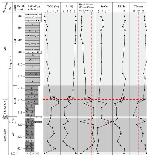 Vertical variation in TOC contents, terrigenous influx proxy Al contents, biogenic source discrimination proxy Sibio/(Sibio + Febio + Al + Cabio), palaeoclimate proxies Sr/Cu and Rb/Sr, and CIAcorr of the Wufeng–Longmaxi Formation in well YD1, showing that the organic-rich shales in the WF and LLM mainly deposited in the warm and humid climate, and the organic-lean shales in the LX and ULM mainly deposited in a warmer and wetter climate. Remarkably, the significant variation of palaeoenvironment caused by the Kwangsian Orogeny [20,21] directly led to the turnover of graptolite biozones from the LM5 in Rhuddanian to the LM6 in Aeronian. Note: The red dotted line represents the boundary of Rhuddanian and Aeronian.
