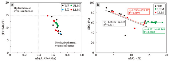 Previous studies have identified three primary sources of siliceous sediments in marine environments: hydrothermal fluids, siliceous organisms, and silica-rich terrigenous clastics [57]. In sedimentary rocks, Fe and Mn are generally enriched with hydrothermal deposits, and in typical sediments influenced by hydrothermal events, the (Fe + Mn)/Ti and Al/(Al + Fe + Mn) ratios are generally valued at >15 and < 0.4, respectively [41]. The analysis shows that all of the samples plot in the nonhydrothermal field, implying that silica mainly had a nonhydrothermal origin (Figure 8a).