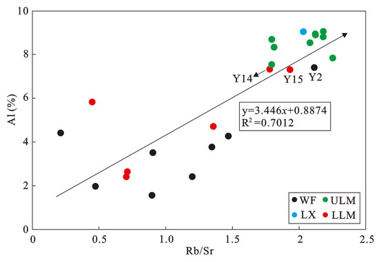 Crossplots of terrigenous influx proxy Al vs. palaeoclimate proxy Rb/Sr show that higher terrigenous influx is closely associated with the warmer and wetter palaeoclimate in the LX, lower WF (sample Y2), upper LLM (samples Y14 and Y15), and ULM.