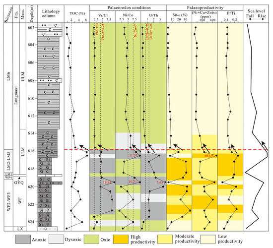 The results show that the curve graphs of V/Cr and U/Th are relatively consistent, and they are apparently different from the Ni/Co curve graph (Figure 10). Therefore, the V/Cr and U/Th ratios are used to evaluate redox conditions. From the bottom to the top, the LX and the bottom of the WF are mainly deposited under oxic conditions that rapidly changed to anoxic conditions in the middle-upper WF. At the end of the late Ordicivian, the GYQ was largely deposited under oxic conditions in the middle Yangtze Platform as a result of the significant drop in global sea level [56]. Subsequently, with the melting of the Gondwanan continental glaciers and the influxing of the freshwater in the early Silurian, the sea level rose rapidly, and the seawater formed a stable stratified water body due to density differences, which resulted in clear vertical difference between the surface and bottom layers with the low content of dissolved oxygen in the bottom water [18,64,65], leading to mainly anoxic conditions of bottom water in the lower LLM. During the upper LLM and ULM stages, as the Kwangsian Orogeny with compressive stress continuously transferred from the South China Plate to the Yangtze Platform in the northwest, Xuefeng uplift was elevated rapidly and even exposed to erosion [16,60], leading to the fall of sea level in the long term. Thus, from sample Y14 in the upper LLM, the bottom water started to change from anoxic to mainly oxic, which is not beneficial to the preservation of organic matter such as the species of graptolite, radiolarian, and sponge spicule, leading to a significant drop in TOC content above the red dotted line.