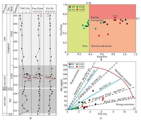 As shown in Figure 11, the average Fepy/FeHR and FeT/Al ratios of the LX, WF, LLM, and ULM are 0.50 and 0.43, 0.62 and 0.52, 0.61 and 0.63, and 0.55 and 0.53, respectively. Therefore, the bottom water in the LLM shows the highest level of anoxia, especially in sample Y12, and the bottom water is in a euxinic condition with peak values of Fepy/FeHR ratios, FeT/Al ratios, and TOC content. Subsequently, the Fepy/FeHR ratios significantly decreased from graptolite biozones LM5 to LM6, which implies that bottom water conditions transformed from ferruginous conditions in the Rhuddanian to oxic conditions in the Aeronian (Figure 11a).