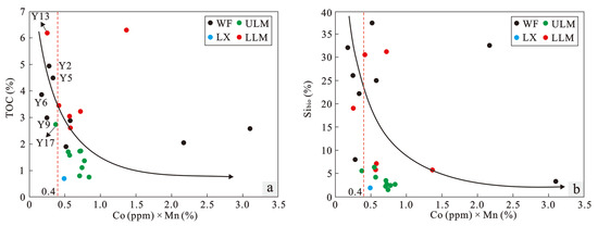 Previous studies have shown that palaeoproductivity is strongly related to the upwelling of nutrients [3] because upwelling can usually bring nutrients from the deep ocean to the shallow shelf, which results in plankton flourishing in surface seawater. The scatter plots show that the Co × Mn values have a perceptible negative correlation with palaeoproductivity proxies TOC and Sibio in well YD1 (Figure 12a,b), which indicates that palaeoproductivity is apparently influenced by upwelling. Remarkably, palaeoproductivity is primarily controlled by upwelling in the WF and the high TOC and Sibio contents of the four samples with Co× Mn values of less than 0.4. Additionally, in the region close to the Qinling Ocean (well EHD1) with strong upwelling, palaeoproductivity is higher than that far from the Qinling Ocean (well JY143) (Figure 1c) [12].