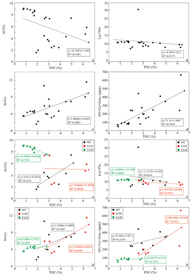 Al is generally considered an indicator element for terrigenous clastic material [5,15]; therefore, the crossplots of SiO2 vs. Al2O3 are usually used to distinguish terrestrial and biogenic silica with a positive correlation, no apparent correlation, and a negative correlation reflecting mainly terrestrial silica, mixed origin of terrestrial and biogenic silica, and biogenic silica, respectively [35]. The results show that silica mainly had a biogenic origin in the WF and LLM, and a mixed terrestrial and biogenic origin in the ULM (Figure 8b). The results show that graptolites are the main sources of biogenic silica in the Wufeng–Longmaxi Formation [13,48] (Figure 2), and there is also a small amount of sponge spicules and radiolarians [13,48,58].
