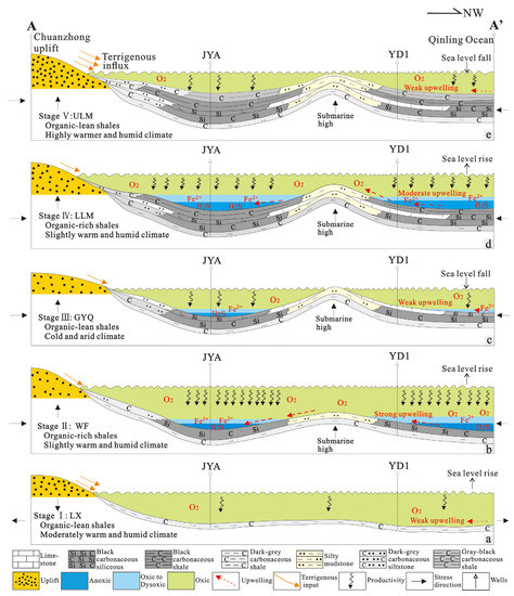 The Fepy/FeHR vs. FeHR/FeT discrimination diagram shows that the LX and ULM were mainly deposited under oxic conditions and that the WF and the LLM were primarily deposited under ferruginous conditions except for sample Y12 with a Fepy/FeHR ratio of 0.72, implying euxinic conditions during this period (Figure 11b). There are three main reasons for the euxinic conditions found in sample Y12 from the LLM. with the first reason regards the melting of Gondwanan continent glaciers and the influencing of the salinity stratification, which led to an anoxic reducing environment in bottom water [18,65]. In addition, in the early Silurian, tectonic compression and uplift continuously transferred from Xuefeng uplift in the southeast to the Yangtze Platform in the northwest [16], leading to strong tectonic subsidence and the formation of a deep-water basin during the Longmaxi stage. Furthermore, the seawater in the study area was confined by the Huangling basement (a submarine high), Hunan–Hubei submarine high, and Xuefeng uplift (Figure 1c), leading to a strongly restricted basin, which was beneficial for forming euxinic conditions.