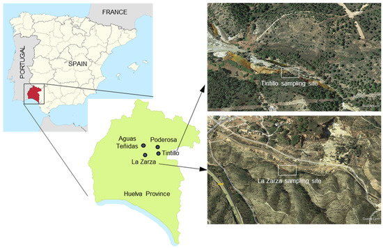 Samples for microbial community analysis were taken from the Tintillo acidic stream (Figure 1 and Figure 2) [23] in order to compare the results with previous microbiological studies in La Zarza–Perrunal effluent [25]. The biomass was obtained by filtration of the water (~300–400 mL) collected in the layer below sites of FMF formation. The samples were filtered over ~0.3 µm glass fiber filters (Advantec Grade G75 glass fiber filters, 47 mm; Dublin, CA, USA) pretreated as indicated in [21]. Filters were stored at −20 °C until laboratory analysis.