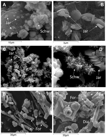 SEM pictures obtained from floating mineral films formed in lab experiments with originally anoxic waters from the Tintillo acidic stream (A,B,E,F) and Guadiana acidic pit lake (C,D). (A,D) show schwertmannite (Schw) with characteristic pin-cushion or hedgehog texture and formed at pH~3.0 coexisting with euhedral crystals of jarosite (Jar) formed at pH~2.2. (E,F) show abundant fossilized organic remnants (For) and sparse diatoms (Dia) in the sample from the Tintillo stream.
