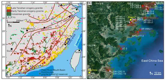 Location of the study area. (a) Distribution characteristics of granite in southeastern coastal area (after Mao et al. (2014) [26]). (b) sample locations. 1. Southern Dabie Mountain fault; 2. Tancheng-Lujiang fault; 3. Nantong-South Liyan-South Lushan-Ruichang-Chongyang fault; 4. Chuzhou-Jiaxing fault; 5. Hangzhou-Xiangtan-Jinxiu-Pingxiang fault; 6. Shaoxing-Jiangshan-Pingxiang-Wuzhou-Hepu fault; 7. Yuyao-Zhenghe-Dapu fault; 8. Lianhuashan fault.