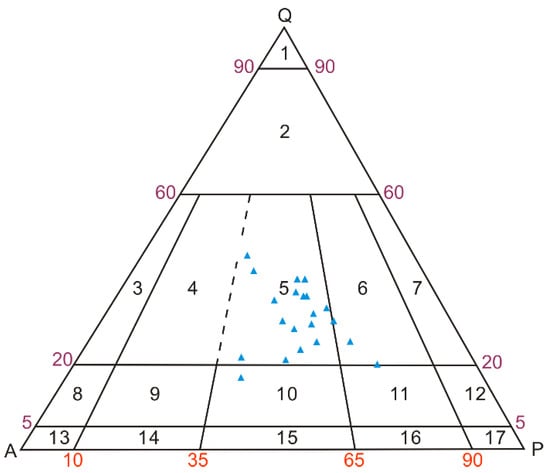 QAP diagram of the Mesozoic intrusive rocks in the coastal area of Fujian Province. 1-quartzolite; 2-quartz-rich granite; 3-alkali-feldspathic granite; 4-syenogranite; 5-monzogranite; 6-granodiorite; 7-tonalite; 8-quartz-alkali feldspar; 9-quartz syenite; 10-quartz monzonite; 11-quartz monzodiorite/quartz monzonite gabbro; 12-quartz diorite/quartz gabbro/quartz anorthosite; 13-alkali feldspar syenite; 14-syenite; 15-monzonite; 16-monzodiorite/monzogabbro; 17-diorite/gabbro/anorthosite.