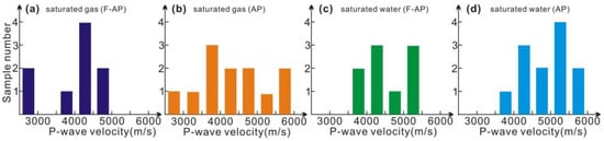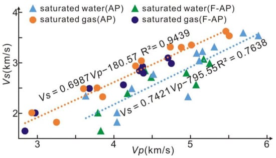 For the granite samples in the gas-saturated condition, the P- and S-wave velocities were 2841–5507 m/s (with a geometric mean of 4111 m/s) and 1646–3623 m/s (with a geometric mean of 2683 m/s), respectively. In the water-saturated condition, the P- and S-wave velocities were 3634–5890 m/s (with a geometric mean of 4664 m/s) and 1646–3859 m/s (with a geometric mean of 2640 m/s), respectively. Figure 5 shows that there is a good linear correlation between the P-wave and S-wave velocities of the granite samples under the gas and water-saturated conditions. Since the P-wave velocity of the water-saturated sample increases obviously while the s-wave velocity hardly changes, the fitting line of the saturated sample is located below the gas-filled sample. Because the P-wave velocity increases obviously, there is almost no change in the S-wave velocity after the sample is saturated with water; the fitting line of the water-saturated sample is located below the gas-saturated sample. Data see Appendix A.