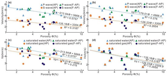 Cross plot of velocity and porosity of the Mesozoic granites in the coastal area of Fujian Province under gas-saturated and water-saturated conditions. (a) Relationship between velocity and porosity under water-saturated conditions; (b) relationship between velocity and porosity under gas-saturation conditions; (c) relationship between P-wave velocity and porosity; (d) relationship between S-wave velocity and porosity. F-AP denotes fractures and dissolution pores samples. AP denotes dissolution pores samples.