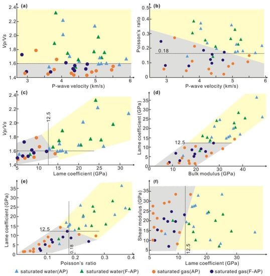 The petrophysical response to fluids was analyzed using intersection plates. As is shown in Figure 5, the P-wave (Vp) and S-wave (Vs) velocities have no obvious distinction for water and gas saturation, and the P-wave impedance (Ip) and S-wave impedance (Is) also have a poor classification ability. The plot of the Poisson’s ratio (σ) versus the P-wave velocity can better distinguish between samples containing water and gas [34,35,36,37,38]. This plot was divided into two areas (light yellow and light gray), and three samples were incorrectly classified (Figure 7b). The plots of the Lame coefficient versus Vp/Vs (Figure 7c), the bulk modulus (K) versus the Lame coefficient (Figure 7d), and the Poisson’s ratio versus the Lame coefficient (Figure 7e) are also good for distinguishing between samples containing water and gas. In addition, three samples were incorrectly classified in Figs. 7c, d, and e. The plot of the shear modulus (μ) versus Lame coefficient (λ) can also be used to distinguish between samples containing water and gas. Bounded by the auxiliary line, two samples were incorrectly classified (Figure 7f). Therefore, these two parameters can be used to further distinguish between samples containing gas and water. In conclusion, the results of this weathered granite reservoir provide a petrophysical basis for identifying gas- and water-containing formations.