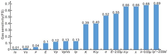 The shear parameters (e.g., Vs, Is, and μ) and bulk parameters (e.g., Ip, Vp, K, and λ) were calculated. The shear parameters and bulk parameters were constructed as combined parameters (e.g., Ip2 − 2.03 Is2, K/μ, λ− 0.03 μ, E − 2.03 μ, and λ/μ). According to the combined parameters, the sensitivity indexes of the physical parameters were calculated. The arithmetic mean values of the shear parameters, bulk parameters, and combined parameters were compared, and in descending order to the sensitivities of the parameters are Ip2 − 2.03 Is2, λ− 0.03 μ, λ, λ/μ, E − 2.03 μ, σ, K/μ, K, Ip, Vp/Vs, Vp, E, μ, Vs, and Is (Figure 8).