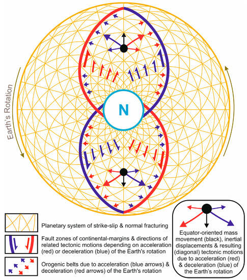 It should also be noted that the most popular explanation of the regional changes in strike-slip tectonics is that they are caused by changes in plate motions. Particularly, the Cenozoic dextral movements in East Asia are linked to the NNW-directed subduction of the Pacific to the Eurasian plates and the Indian–Eurasian collision [,]. There is no objection for this. However, the question is the following: what directs these plate movements? Could it partly be the decelerating Earth’s rotation? Yes, just because the rotation is primary relative to plate tectonics, although the former may secondarily depend on the latter [].