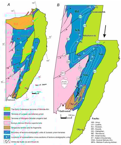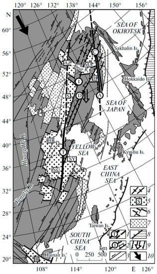 The most studied tectonic zones on the East Asian margin belong to the Tancheng–Lujiang (Tan–Lu) and Sikhote–Alin fault systems (Figure 2; [,,,]).