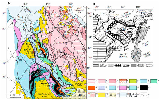 South Anyui Suture and Kolyma Loop on the geological (A) and tectonic (B) schemes of NE Asia after [].