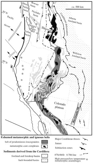 The paleotectonic studies arguing the Jurassic and early Cretaceous sinistral shearing followed by the late Cretaceous–Cenozoic dextral shearing in western North America are also numerous [,,,,,,]. They can help us to define the time of sinistral-to-dextral strike-slip transformation in western North America.