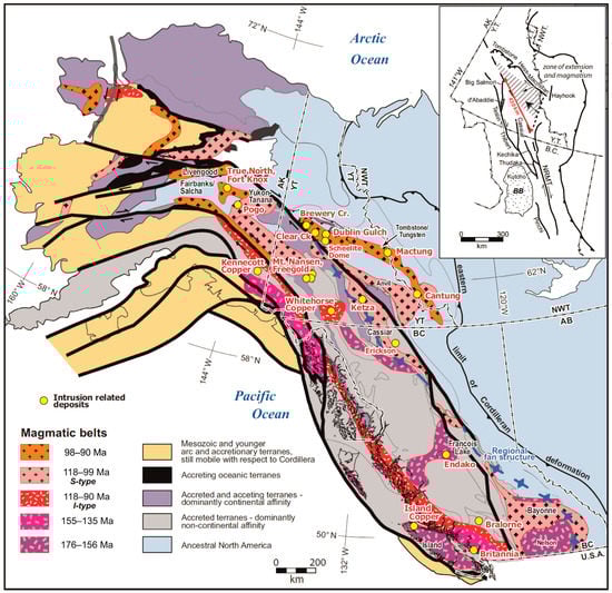 Middle Jurassic to mid-Cretaceous tectonics, magmatism and associated deposits in the Canadian and Alaskan Cordillera after []. Inset shows relationship of the Early Cretaceous transcurrent faults and inferred zone of extension and magmatism in northern British Columbia and southern Yukon after []. AK, Alaska; YT, Yukon Territory; NWT, North–West Territory; BC, British Columbia; NRMT, the Northern Rocky Mountain Trench; BB, Bowser basin.