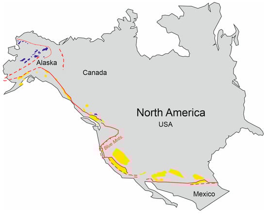 The Mexico–Alaska sinistral megashear (red line with red dotted extensions) with associated mid–late Jurassic pull-apart basins (yellow) and mélange (blue) simplified after [].
