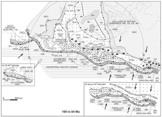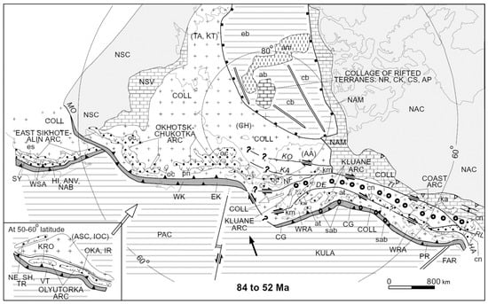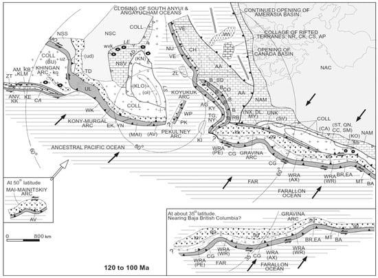 This section of our review is based on numerous geological materials compiled and summarised as the Phanerosoic tectonic paleoreconstructions by the international group of authors from U.S. Geological Survey, Exxon Exploration Co., Geological Survey of Canada, Michigan State University, Russian Academy of Sciences, University of Alaska, University of Texas, and Yakutian Academy of Sciences []. Figure 9, Figure 10 and Figure 11 reproduce three of these reconstructions showing the tectonic evolution of North Pacific continental margins at 120–100 Ma, 100–84 Ma, and 84–52 Ma, respectively.