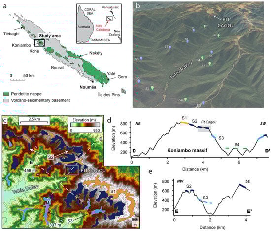 (a) Location of New Caledonia and Koniambo. (b) Aerial view with the indication of paleosurfaces (S1 to S4). (c) Location of the study site (open pit Cagou from KNS mining company) in the Koniambo massif. (d,e) Cross sections are in (c) (D-D′ and E-E′), with the indication of S1, S2, S3 paleosurface (in yellow, dark blue and light blue respectively) and the potential location of S4 (green dashed line).
