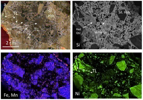 Breccia clasts include predominantly silicified rock fragments (noted silicified clasts) and a few clasts of ore Type I crack-seal infillings. The latter are brownish iron-rich microcrystalline quartz with relics of early blueish-green talc-like (Figure 4a,b). They are enriched in Ni and have micro-fissures and microvugs filled with Mn-oxides. Silicified clasts of host rocks are enriched in iron but are less rich in metals than red-brownish quartz. Micro-XRF images of a breccia sample (Figure 5a) and the corresponding chemical maps (Figure 5b–d) show that white quartz rims are almost free of metals, which are, on the contrary, relatively abundant in the other clasts. The clasts of microcrystalline red quartz are Fe-rich and contain spots and micro-fissures of Mn-oxides (Figure 5c). Most clasts, including silicified host-rock, contain Ni in their mass (Figure 5d), besides the visible ore clasts composed of Ni-Mg talc-like inclusions (noted TL for talc-like).