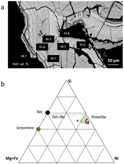 Pimelite formed on the quartz rims and constituted the final filling of the breccia (Figure 3c,e and Figure 4d,e). This constantly develops over a succession of quartz cement increments described above, ending in a geode. Pimelite forms botryoidal layers of dark green colour, showing strong contrasts of chemical mass (Z) in the section, displaying the growth zones (Figure 4c,d and Figure 6a). As shown in Figure 6a, magnesium is always lower than 2 wt% and has limited fluctuation, with NiO contents remaining between 43 and 49 wt%. Such Ni concentrations correspond to the extreme pole of the Ni-Mg kerolite solid solution (NiO = 39% to 49%) (Figure 6b). This pole is characterized by a high-frequency Raman spectrum marked by a principal OH band at 3650 cm−1 and a shoulder at 3660 cm−1, typical of pimelite []. As already observed in the case of target-like Ni-rich talc-like, pimelite does not show extended Ni-Mg substitution and is close to the end member of the solid solution.