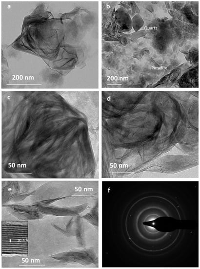 When observed under TEM, the pimelite botryoidal texture consists of subparallel flexuous flakes (Figure 7a), which are sometimes associated with bi-pyramidal quartz (Figure 7b) but are primarily mono-mineral associations of tiny crystals of 50 to 150 nm in length (Figure 7c,d). The HRTEM images show that the flakes are made of the piling of no more than fifteen to twenty layers, generally less [,]. The spacing is close to 10 ± 0.5 Å among incertitude due to particle orientation and typical of talc-like [] (Figure 7e,f). Although well crystallised, the coherent domain is small, explaining the relatively smooth XRD patterns and the difficulties in obtaining good diffraction patterns under TEM. The pimelite flakes are not associated with serpentine-like layers, which are entirely lacking.