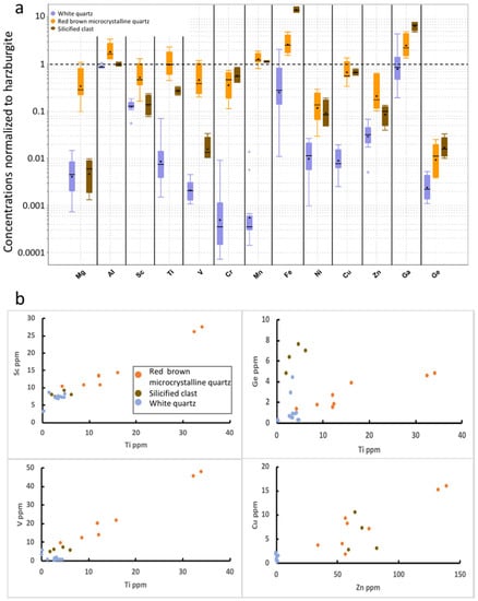 Trace elements in red-brown microcrystalline quartz, silicified clast and white quartz cement. (a) Normalised concentrations to harzburgite concentrations. (b) Binary plots, Sc-Ti, Ge-Ti, V-Ti and Cu-Zn for the three types of quartz.