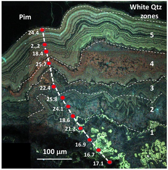 δ18O (‰) values along a profile crosscutting white quartz from silicified breccia to the centre of the cavity (Zones 1 to 5). The colloform pimelite appears in black in the central vug. δ18O values are reported on the cathodoluminescence image.