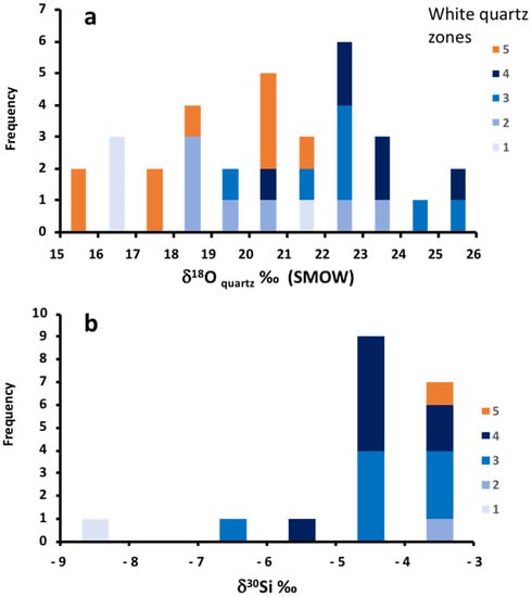 The oxygen and silicon isotopic composition of the quartz samples was determined using the CAMECA IMS 1270 ion microprobe at CRPG (Nancy, France) using classical procedures previously described by Rollion-Bard et al. (2007), Robert and Chaussidon (2006) and Marin et al. (2010) [,,]. Oxygen and silicon isotopic compositions are reported here as per mil deviations from SMOW standard (Standard Mean Ocean Water) and NBS 28, respectively, using the conventional notation: