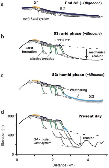 Pre-existing fracturing related to ante- to syn-obduction deformation stages was reactivated at several periods, notably during extensional stages from Miocene to the late Miocene. This extension is at the origin of the reactivation of normal faults of serpentine planes, which are most often oriented in the island’s axis, i.e., NNW–SSE, and generally a receptacle for fluids charged with Ni by the dissolution of both overlying rocks and pre-existing mineralisation. A tentative reconstruction of this dynamic evolution is proposed in Figure 11, with four corresponding stages: first, the late Paleogene period with two main plateau surfaces, followed during the Neogene period, by the formation of S3-S4 paleo-weathering surfaces synchronous of the karst formation and deepening.