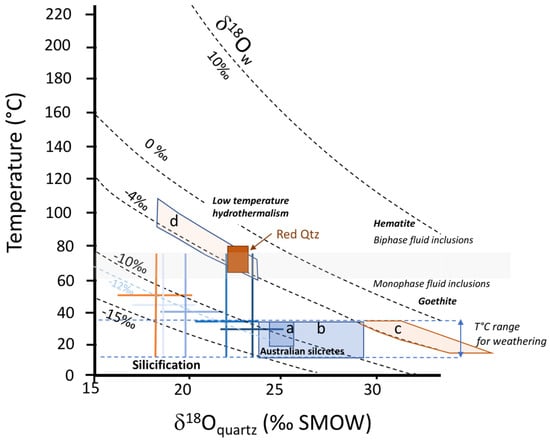 δ18O quartz versus temperature diagram with reference lines for oxygen isotopic compositions of water (δ18O w) reported from Matsuhisa et al. (1979) []. Data for the white quartz from Koniambo pseudo-karst are represented as crosses using mean values and ranges for the five zones described in Figure 4f and Figure 9 with the same colours as in Figure 9. Temperatures are reported arbitrarily between 15 and 75 °C and crosses are organized to follow the water δ18O value of −12‰ found in other silcretes. For comparison, δ18O ranges and estimated temperatures for Lake Eyre silcretes are reported in the box a from [] and other Australian silcretes in box b from []. Two domains calculated for present-day waters in tropical countries of −2‰ and −4‰ are reported for two temperature ranges (15–35 °C (domain c) and 60–110 °C (domain d). The estimated temperature range for red microcrystalline quartz is reported in the brown box. The boundary in grey indicates the limit of stability of goethite and hematite, as well the temperature fields for monophase and biphase fluid inclusions.