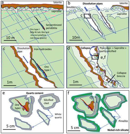 Main stages of silicified collapse breccia formation: (a) Formation of laterite and ore Type I as crack-seal fractures. (b) Development of dissolution pipes along previous fractures. (c) Detail of the dissolution pipes (inset c from b) with edges affected by saprolitisation and a layer of iron hydroxides. (d) Silicification and then the collapse of the dissolution pipes. The box refers to figures (e,f). (e) White quartz cement precipitation on clasts of silicified host rocks, and clasts of early ores. (f) Precipitation by evaporation of nickel-rich silicate (pimelite) on the white quartz rims.