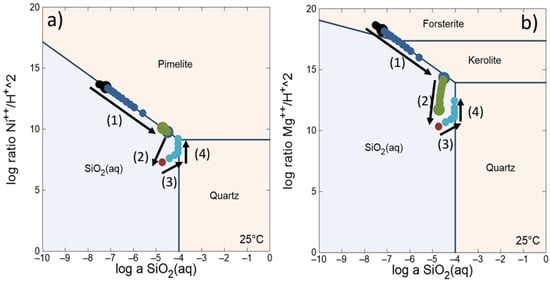 After quartz precipitation, Ni silicate (pimelite) enrichment is explained by the redistribution of Ni from previous Ni silicates in fractures (ore stage 1) from the overlying levels and from harzburgite silicate dissolution. There is a need to increase the Ni2+/(H+)2 ratio to reach oversaturation with respect to talc-like at sub-constant or slightly increasing silica activity in a solution (step (4) in Figure 15a). Notably, the solution reaches its saturation with respect to the pimelite (Figure 15a) and not to kerolite for a partial evaporation state (Figure 15b). Hence, total evaporation seems to be never reached, explaining the absence of Mg-talc-like (kerolite) after the quartz precipitation, while pimelite is precipitated.