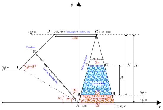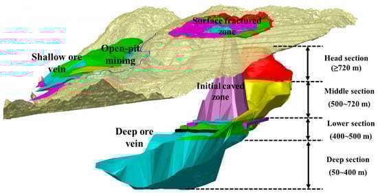- Taking the combined mining of the Dahongshan Iron Mine as an example, a mechanical model for calculating the surface movement range was established according to the zoning characteristics of surface movement to reveal the movement mechanism. The change in topography caused by open-pit mining, the shape of the caving zone, the gravel filling of the caving zone and the mining depth were considered in the model.