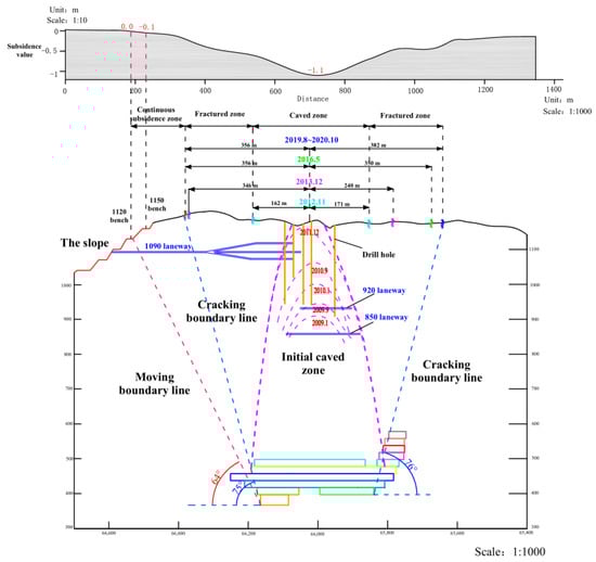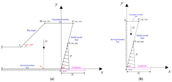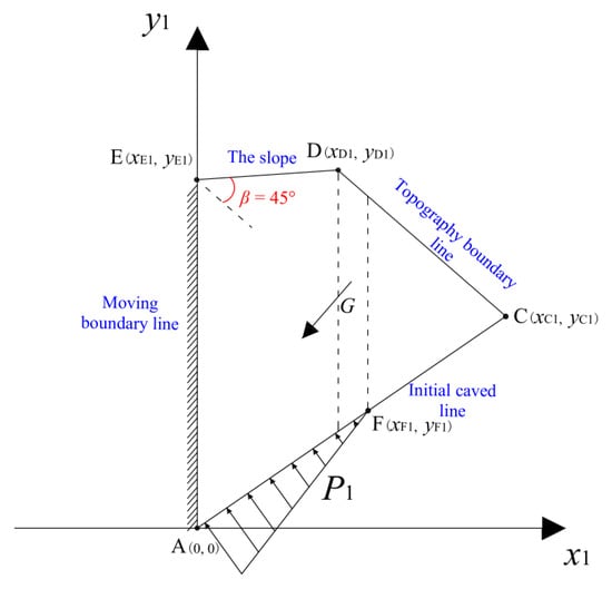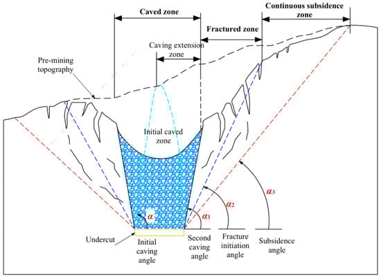- Based on the mechanical model, the definition of the subsidence angle was supplemented: the subsidence angle is the angle measured from the horizontal of the moving boundary line, a straight line with zero displacement from the edge of the deepest extraction level to the surface and the largest surface cracking range.