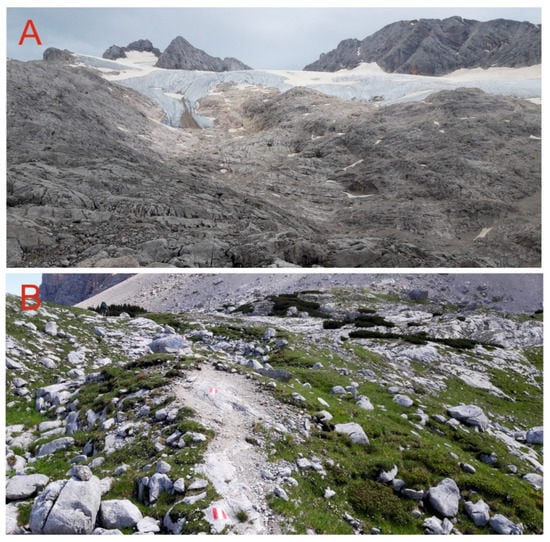 (A)—Upper part of the Hallstätter Glacier foreland, (B)—Little Ice Age moraine.