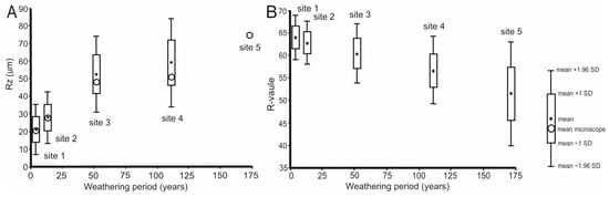 Rock surface micro-roughness (A) and strength (B) changes in the Hallstätter Glacier foreland. Box-and-whisker diagrams shows results obtained from the Handysurf and circles show additional results from the KDM (A).