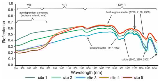 Measurements of spectral reflectance also revealed the general pattern of time-dependent changes (Figure 4). We observed a decrease in the reflectance in visible radiation (380–750 nm), most significant between sites 1 and 3. However, there was an unexpected increase in the reflectance of the near-infrared and short-wavelength infrared radiation (750–2500 nm) on older sites (4 and 5).