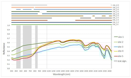 Statistically significant differences between reflectance spectra of the test sites (significance level α = 0.05). The differences between particular pairs of curves are shown by overlapping horizontal lines, and differences between all sites are shown by gray columns.