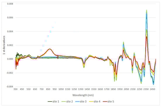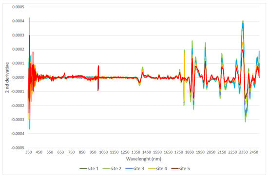 Several interesting spectral features were visible in the derived spectra that were invisible in the original spectra. For example, for the 1-degree derivative there were subtle changes in curvature between 700 nm and 1000 nm that were consistent across the set of spectra for sites 4 and 5 (Figure 6). Additionally, for wavelengths indicative for calcite content—2000 nm and 2350 nm—shifts of the first derivative and second derivative were visible, where a shift indicating changes in curvature from convex up to convex down and back to concave up could be seen, indicating subtle, consistent changes in reflectivity (Figure 6 and Figure 7). This relationship was also evident in both derivatives for the range imaging fresh organic matter, i.e., 2180 nm and 2309 nm (Figure 6 and Figure 7). Although the original spectra differed in magnitude between 400 nm and 1300 nm (Figure 4, Figure 6 and Figure 7), they had almost identical second-order derivative values in the same wavelength range. The differential range of the curve from site 4 and site 5 in the case of the 1-degree derivative in the spectrum 750–950 nm may illustrate the occurrence of cyanobacteria (dry condition), as confirmed by other authors [41].