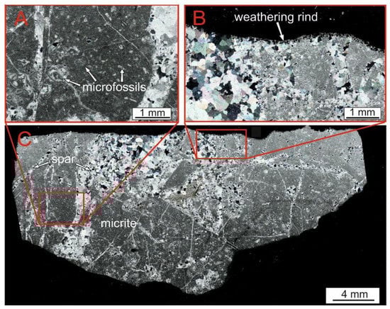 The petrographic analysis under the optical microscope revealed that the rocks could be classified as micritic limestone, in most cases, but sometimes also as calcareous grainstone, packstone, wackestone, or dolomitic mudstone. The rocks were strongly altered by secondary processes related to hydrothermal activity, resulting in numerous spar veins (Figure 8), occasionally phlogopite or biotite, tectonism (micro-faults and secondary calcite infills), and diagenesis (stylolites formed due to pressure dissolution or micrite recrystallization). In places, numerous foraminifera, cephalopods, fragmented gastropods, with characteristic wavy shell ornamentations, or bivalves shells could be seen (Figure 8A), as well as ellipsoidal or spherulitic peloids or single ooids. Sometimes, dolomite was found inside micro-fossils as euhedral rhomb-shaped crystals. There were differences in the micro-structures seen inside the weathering rinds depending on the type of matrix (micrite or spar); however, they were not clearly visible under the optical microscope (Figure 8B,C).