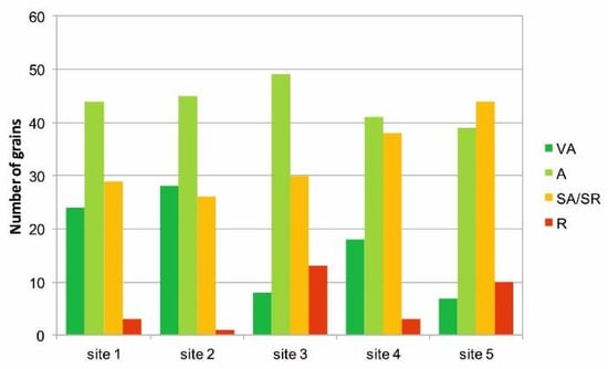 Rounding of grains within the granular layer of weathering rinds (VA—very angular, A—angular, SA/SR—sub-angular/sub-rounded, R—rounded).