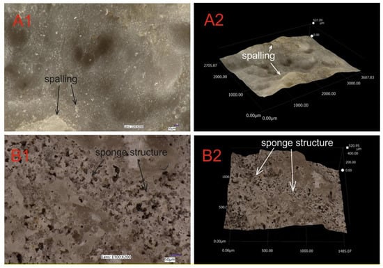 Images of the rock surface from site 1 (A1,A2) and site 5 (B1,B2) obtained under the Keyence Digital Microscope. Note that sponge structures develop mostly in concave parts of the rock surface (B2).