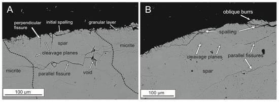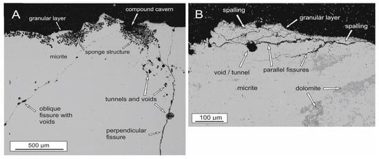 The surface of the rock at site 1 was characterized by intergranular disintegration (granular layer), which penetrates the limestone down to 100 μm and is best developed in micrite. Grains varied from 2 µm to 12 µm (smaller grains tended to be closer to the rock surface), very angular to sub-rounded, with angular being the most abundant (Figure 9). Internal voids were very angular (Figure 11). Cracks running mostly parallel or slightly sloping to the rock surface were present at depths down to 40–100 μm (rarely 400 μm), and in places they resulted in surface spalling. There was a clear change in surface preservation where spar veins met the surface (Figure 11A). In such cases, micro-cracks were rather oblique to the rock surface, wider, and the superficial granular layer was not developed. Sometimes, the smallest fissures ran along the cleavage planes of a spar. In some places, at a depth of c. 100–120 μm, stylolite-like structures were present. There were also common oblique burrs developed on rock surfaces composed of spar (Figure 11B). Some far-reaching alterations of the rock surface, e.g., micro-cracks down to depths of up to 1500 μm, were observed.