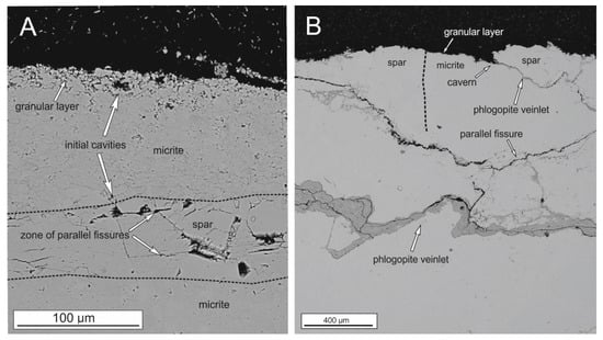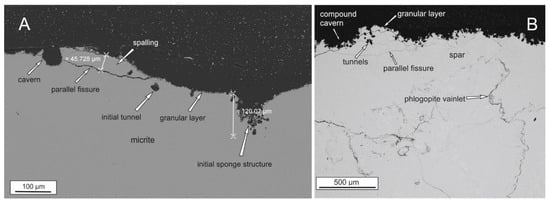 Weathering rind at site 3 (subject to the weathering for 50–51 years); (A)—single cavern and initial sponge structure developed in micrite; (B)—deep fissures filled with phlogopite, a compound cavern with initial sponge structure in spar (images from FE-SEM).