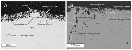Older weathering rinds (subject to weathering for 50–172 years) exhibited similar micro-structures as the young ones, with granular layers on micritic surfaces, oblique burrs developed in spar, and parallel fissures leading to spalling. However, new micro-structures could be observed: caverns, compound caverns, rounded voids and tunnels, and sponge structures (Figure 13, Figure 14 and Figure 15), which are best developed in concavities, e.g., in the floor of compound caverns (Figure 13 and Figure 14A). These micro-structures were relatively rounded and had smooth inner surfaces, whether they were formed in micrite or spar. Caverns developed in micrite usually had a granular layer on their walls. The grain diameter varied, but smaller grains tended to be closer to the rock surface. The rounding of the grains within the granular layer was slightly better in comparison with the younger weathering rinds, and the grains were frequently larger (the diameter varied from 2 µm to 25 µm), but the thickness of the granular layer was smaller (up to 50 µm). Signs of spalling were usually observed on the protruding convex parts (Figure 13A and Figure 14B). In places, oblique or perpendicular fractures were filled with phlogopite or accompanied by voids. Cleavage planes of spar crystals sometimes determined the places where elongated voids developed (Figure 15B).
