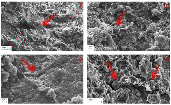 SEM images showing: (A)—microbial biofilm (test site 1), (B)—actinobacteria-like cells (test site 4), (C)—fungi (test site 4), and (D)—epilithic cyanobacterial cells embedded with secondary calcite (test site 5) observed on the surface of the weathering rinds from all test sites (Hallstätter Glacier foreland); arrows indicate microbial cells.