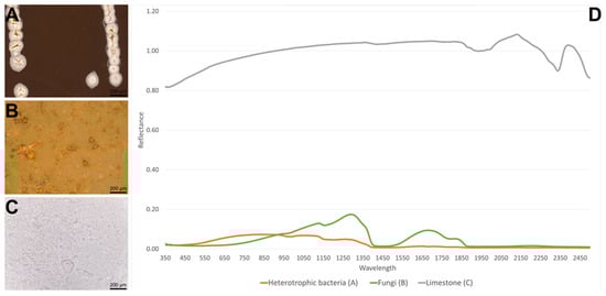 To confirm the above assumptions, spectral reflectance was measured for: (i) colonies of heterotrophic bacteria (Figure 17A), (ii) fungi (Figure 17B) isolated from site 3A, and (iii) Dachstein limestone powder (Figure 17C). Characteristic changes in reflectance at 2000, 2350, and 2500 nm were observed (Figure 17D). Measurements of colonies of heterographic bacteria showed the greatest values in 450–1400 nm, with fungi in 750–1400 nm and 1500–1870 nm ranges. The unexpected increase in reflectance on sites 4 and 5 (see Figure 4) can be therefore interpreted as a result of microorganisms and a higher content of secondary calcite produced by biomineralization (in 2000, 2350, 2500 nm).